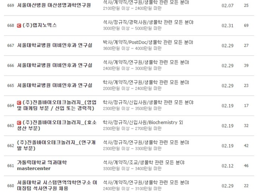 못믿겠으면 생물학 정보 커뮤니티에서 구인구직란에 있는 정보 첨부했다. 저기 표시된 것보다 실제로는 덜준다.