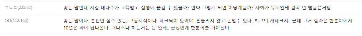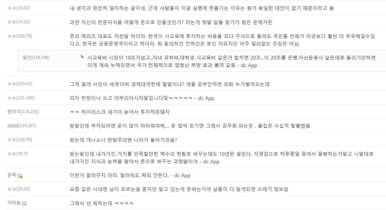 요즘 미국 엘리트들은 FIRE라고 해서 젊을때 돈 오지게 벌어서 30대에 은퇴하는게 유행이라며? 한국에선 왜 이런 운동이 안일어나냐고 공부를 하더라도 좀 돈이 되는 공부를 하던가, 공무원 공부 취업 공부에 몇년을 허비하고 돌아오는건 월 3~400?