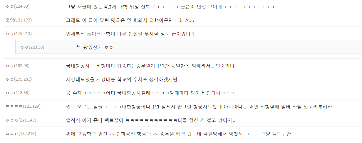내가 위에 말한것은 주변 지인들이나 아는 사람들중에 스튜어디스가 있는 사람들이나 또 스튜어디스를 사귀어본 사람이거나 또는 여자들중에 내 글을 본 사람이 있다면 여자들은 학창시절때 일진들이 어떠했는 지 알테고 내가 한 말 아마 공감을 할거고 스튜어디스에 대한 환상이 있는 애들은 이해를 못할거임. 마지막으로 내가 결국 말하고자 하는 건 우리나라 다양한 직업들중에 내신5~7등급도 들어가고 또 토익 500~600도 합격되는 직업인 승무원을 보고 배운 직업이다라고 하는 나라는 전세계에 다 합쳐봐도 아마 우리나라밖에 없을거임.