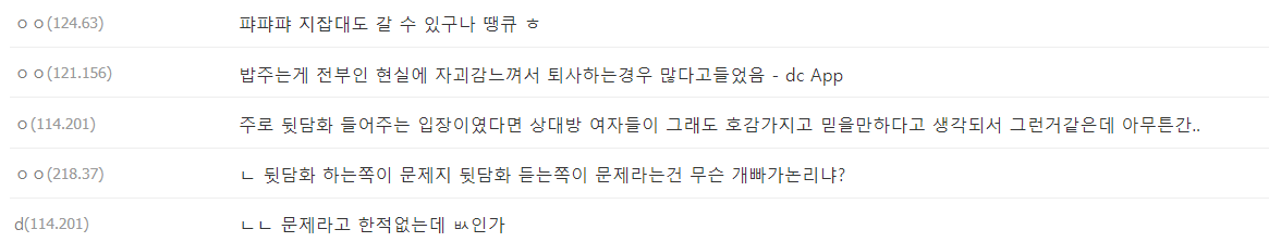 특히 교육 3개월 동안 좀 친해지고나니 넌지시 남자 차, 집 등 구체적인 조건을 대놓고 따지는 동기도 있었고 다른 팀에 모 여자동기를 언급하며 화장을 떡칠을 한다느니, 걸을 때 끼부린다느니 소곤소곤 뒷담화를 하는 경우도 종종 보았습니다. 이러한 것들이 일반적으로 여자들이 서로 친해지는 하나의 과정이라고 생각할 수도 있기 때문에 그려러니 했지만, 인제 갓 입사한 신입사원에 겨우 3개월밖에 되지 않았는데 이런 식으로 다른 사람을 흉보는 모습이 남자인 저로서는 매우 의아했습니다. 그리고 본격적으로 비행에 투입되면서 시작된 건, 뒷담화 들어주는 게 제 주업무였다고도 할 수 있습니다. 국내 항공사는 매 비행때마다 같이 탑승하는 승무원이 바뀌는데 비행 전 회의를 하면서 서로 어색해거나 눈도 안 마주치는 여승무원들이 있습니다. 비행기에 타고나면 백발백중 서로 사이가 안 좋은 겁니다. 부사무장은 비행 중 해당 여승을 가리키며 뒷담화를 하는 건 물론이고 쟤한테는 도와주지 말라 라는 식의 경고 아닌 경고를 하기도 했었습니다. 그럴 때마다 참 난감했습니다. 어떻게 반응해야 할지도 몰랐고 혹시나 제가 해당 여승에게 호의를 베풀면 부사무장 눈에 날까봐 걱정이 되기도 했습니다. 기타 이런 일 외에도 같은 비행기 안에서 뒷담화는 물론이고 해외에서 체류할 당시에도 다른 여승을 언급하면서 비꼬는 듯한 이야기를 하는 경우도 종종 보았습니다.