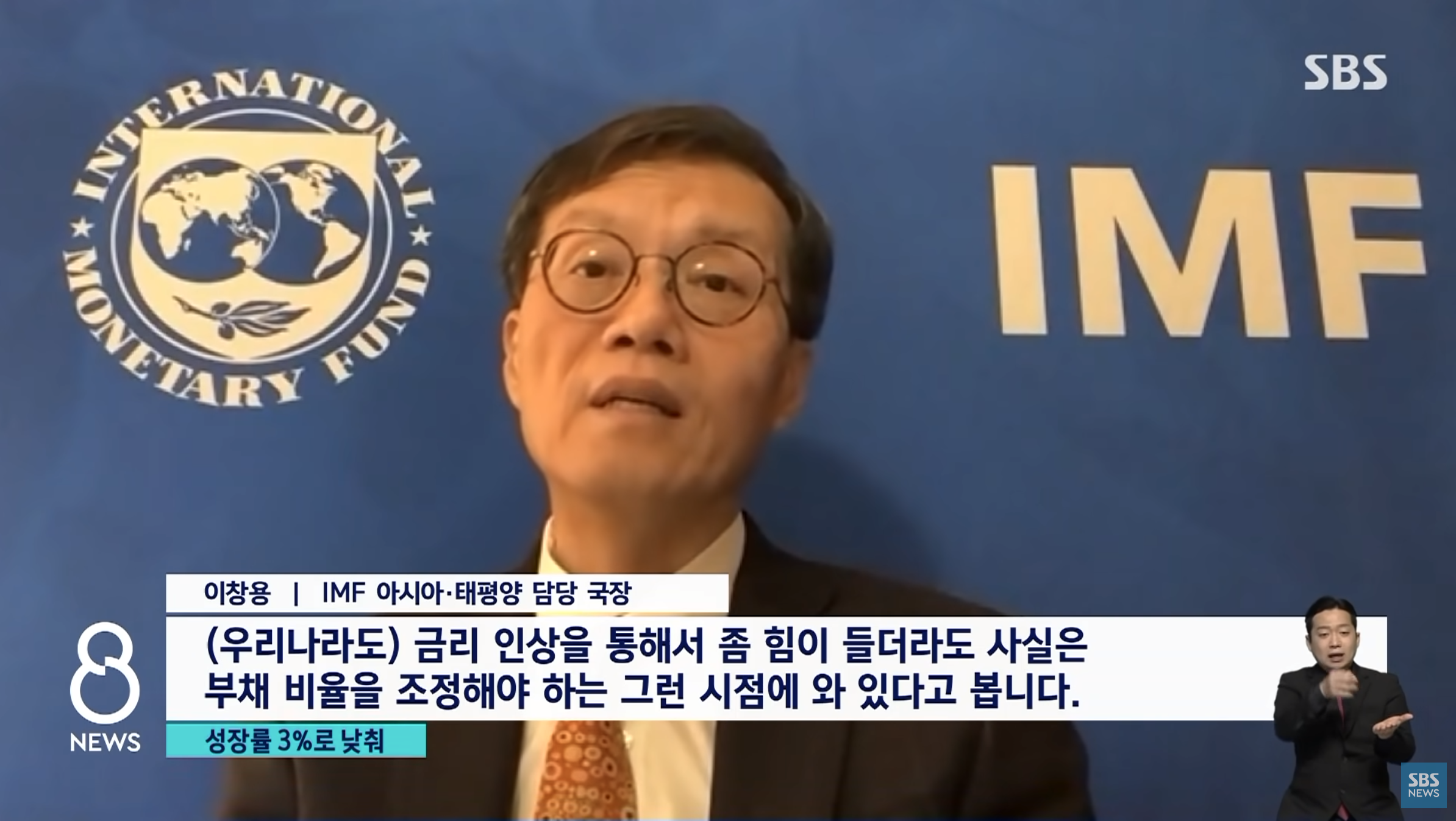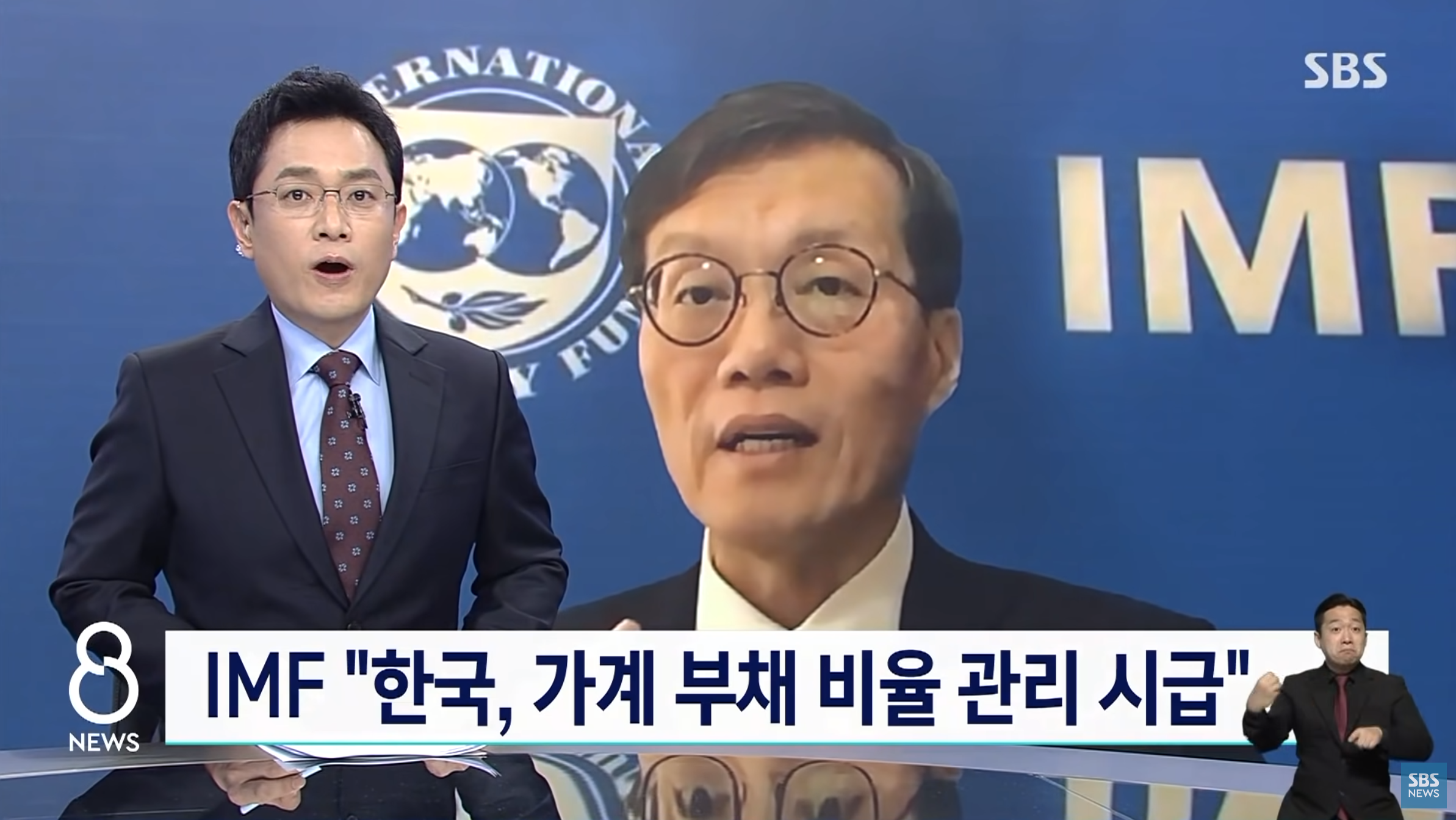 IMF 측에서 한국의 가계 부채 비율 관리가 시급하며 유동성에 의존해서 부채 비율이 계속 늘어나게 되면 향후 굉장히 금융시장에 안 좋은 영향을 줄 수 있기 때문에 (우리나라도) 금리 인상을 통해서 좀 힘이 들더라도 사실은 부채 비율을 조정해야 하는 그런 시점에 와 있다고 차기 한국은행 총재인 이창용 IMF 아시아 태평양 담당 국장이 2월에 인터뷰를 하였습니다.