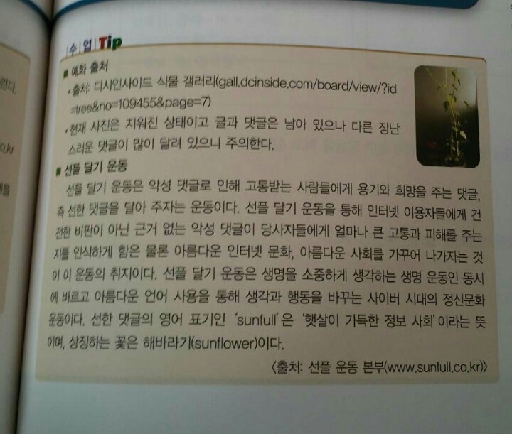 기르기 시작한 이상 더 이상 잡초가 아니라는 따뜻한 댓글이 달려 선플 운동 본부에서 추천하여 교과서에까지 디시 식물 갤러리가 등재된 것입니다.