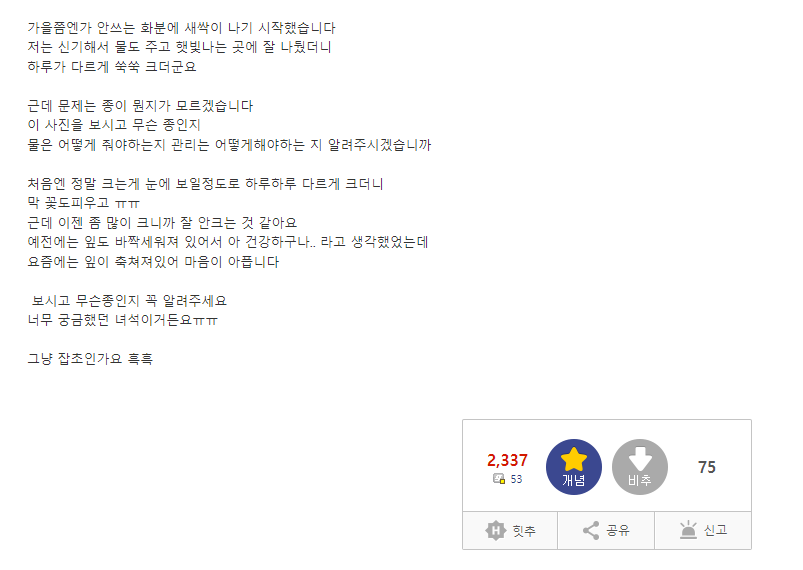 디시인사이드 식물 갤러리에 무슨 종인지 알려달라는 한 네티즌의 글이 올라왔습니다.